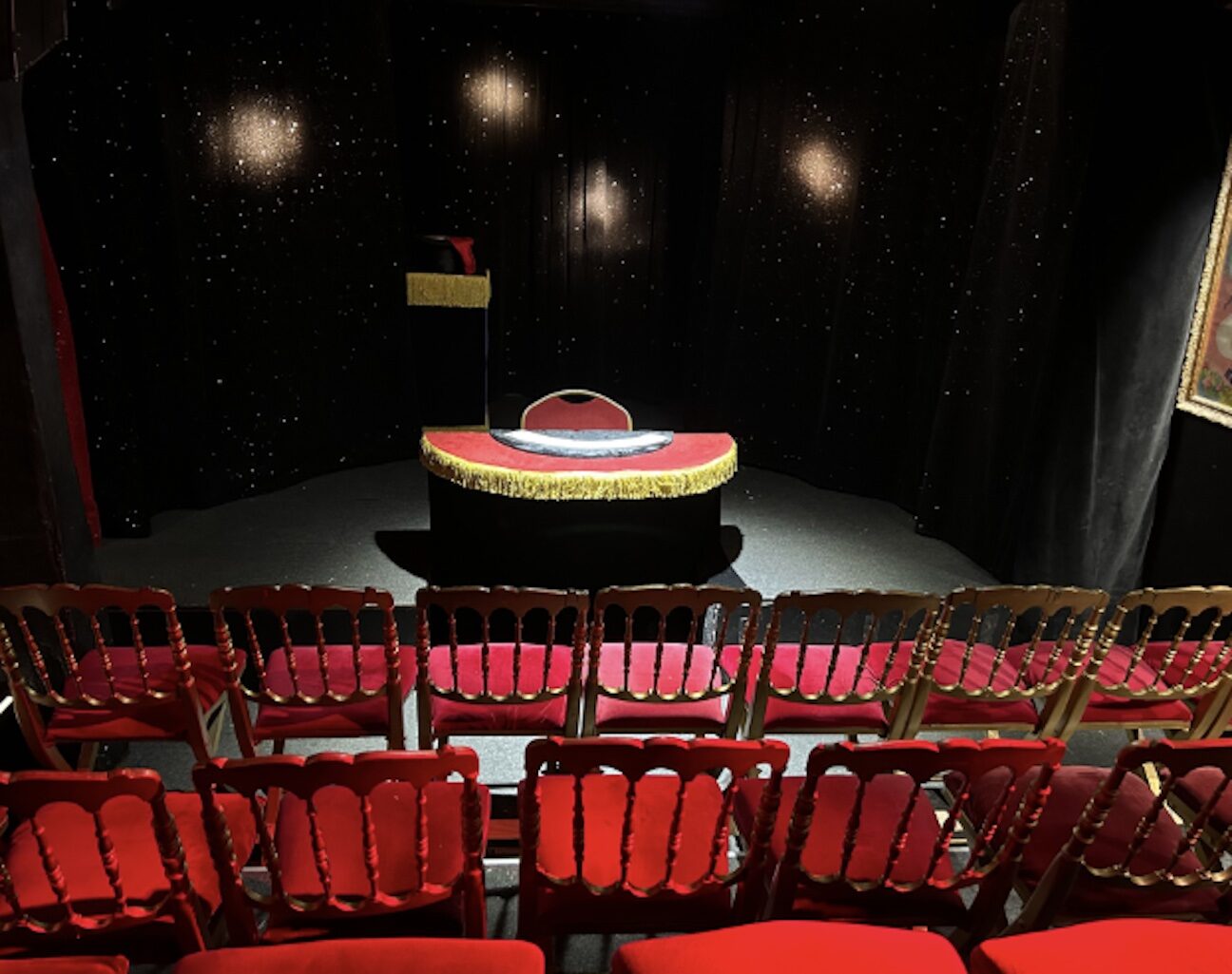 C’est un très joli petit théâtre aux sièges rouges et or, disposés en gradins avec une visibilité parfaite. Les murs qui sont décorés d’affiches anciennes colorées et d’objets magiques, confèrent à ce lieu une ambiance mystérieuse… L’Antre Magique des spectacles pour rêver…m